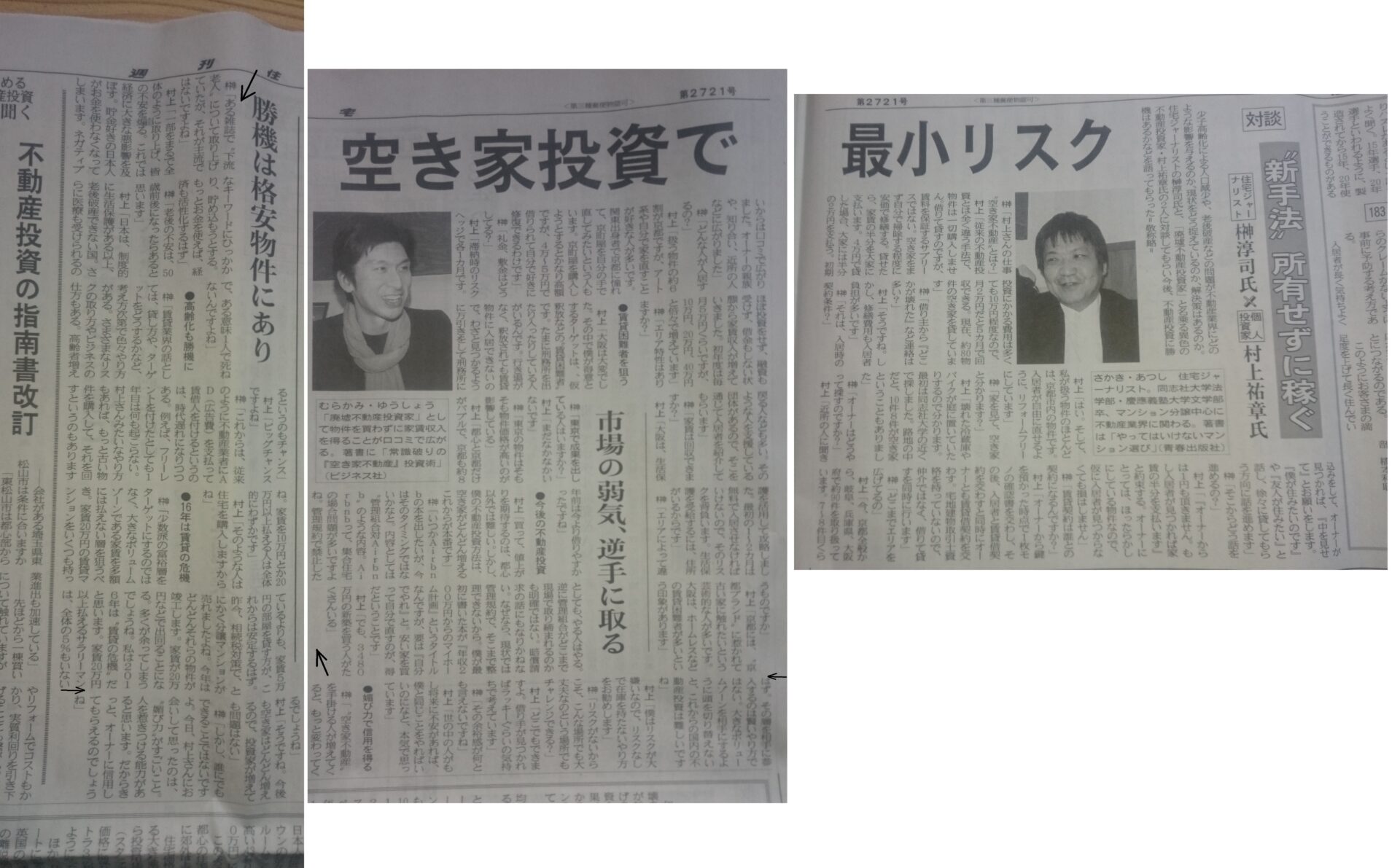 新聞に大きく掲載されました 2016年3月26日 2021年9月13日 WRITER haikyo この記事を書いている人 - WRITER - haikyo 週刊住宅新聞に、2面にわたってかなり大きく掲載されました。 今月は半分以上、海外にいたので、教えてもらうまで気付きませんでした。 新聞をクリックすると全文をお読みいただけます。 村上祐章 廃墟不動産投資家をもっと見る 購読すると最新の投稿がメールで送信されます。 メールアドレスを入力... 購読 廃墟不動産投資のコンサルを始めました! この記事を書いている人 - WRITER - haikyo 物件をマイナス円ゲットする達人 ↓ ↓ 前の記事 -Prev- 物件無料GETの3手法 次の記事 -Next- 引き寄せの法則により、榊淳司さんとの対談が実現!今日の随筆 関連記事 - Related Posts - DVDリニューアル(廃墟不動産投資と物件無料ゲットとAirbnb) 拙著と、「説教されました」の分析 拙著が2冊でようやく累計2万部を突破しました Amazonで紙の本になりました 『不動産投資の常識を極度に打ち破る! 物件無料ゲット法』 最新記事 - New Posts - 廃墟不動産投資家・村上祐章 生涯の野望と挑戦(第1回/8) なぜ海外放浪しながらたった半月で、すでに8軒も物件を無料またはマイナスゲットできるのか? 後編 (動画)入居付けが厳しくても仕入れを安くすれば良い 0万円にこだわらないこと なぜ海外放浪しながらたった半月で、すでに8軒も物件を無料またはマイナスゲットできるのか? 中編 銀行融資を受けなくても「家賃」をゲット ↓↓ - Comments - コメントをキャンセルメールアドレスが公開されることはありません。 ※ が付いている欄は必須項目ですコメント ※ 名前 ※ メール ※ サイト 新しい投稿をメールで受け取る