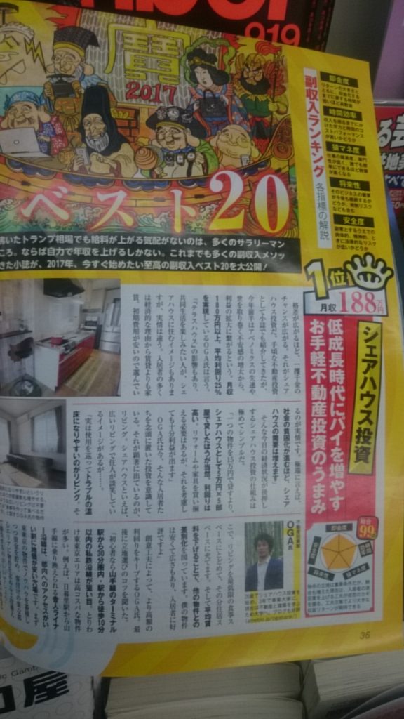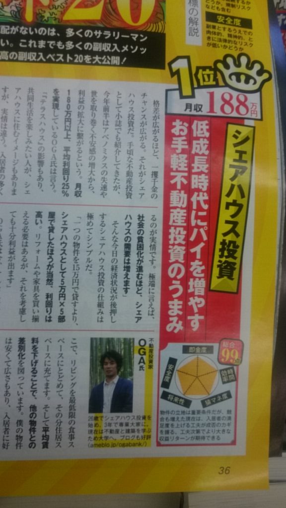 あなたの利回りが8%なら、これをすれば16%になります。     あなたの利回りが12%なら、これをすれば24%になります。     あなたの利回りが15%なら、これをすれば30%になります。     あなたの利回りが20%なら、これをすれば40%になります。     いきなり答えを言いましょう。     普通に貸すんじゃなく、シェアハウスにすればいいんです。     今日は、副収入で月収188万を得ている大学生大家・OGAさんの企画のご紹介です。   賃貸物件の収益は、   普通に貸す < シェアハウス < マンスリー貸し < Airbnb < 宿泊業(ホテル、旅館、宿)   となるはずです。     例えば、普通に貸せば5万のところ、Airbnbで1日あたり8,000円にして、20泊取れれば16万となり、   随分と稼げます。     しかし、稼げる貸し方であればあるほど、手間も増えます。     例えば、マンスリー貸しより宿泊業のほうが稼げるけども、手間は比較にならないほど激増しますし、   マンスリー貸しより普通に貸すのは儲からないけども、手間はかなり減ります。     シェアハウスは普通に貸すのとマンスリー貸しの中間に位置します。     マンスリーのように頻繁に入退去はないものの、   普通に貸すときと比べてやはりハウスルールを設定する必要があったり、   住人同士のトラブルが増えたりして、手間は増えてしまうのです。   シェアハウスの考案者 大学生大家のOGAさんが雑誌SPA!に取り上げられています。     OGAさんはよく雑誌に載ります。     本人のブログで「メディア履歴」として一応まとめられてはいますが、もっと頻繁に取り上げられていると思います。     シェアハウスの考案者 大学生大家のOGAさんのスゴイところは、   シェアハウスなのにマンスリー貸しレベルの収益を得て、   シェアハウスなのに普通に貸すときと同じかそれ以下の労力しか使っていないところです。     彼はセミナーや塾は一切やらないようです。     不動産投資業界で長期間、トップクラスの安定した実力を保ちながら、   我が道を行くスタイルで、あまり公には姿を表さないレアキャラです。     そんなOGAさんを引っ張り出すことに成功しました!     久々に私の企画に登場していただくこととなりました。     借り入れがある人や、借り入れを検討している人には喉から手が出るほど聞きたい裏技・マル秘情報も、彼にお話ししてもらえます。 記事に紹介されていることのほか、   どうすれば効率的にシェアハウスで大きく稼げるか、   分かりやすく楽しくお話ししてもらいます。     なお、私は廃墟不動産投資家なので、私ならではの秘技や奥義もお話しできます。     参加者特典として、私が扱っている大阪の一等地(キタエリア・中之島、大阪環状線徒歩9分)のお屋敷物件を9.9万円でお貸しします。     30,000円で9室取って270,000円になります。     シェアハウス向きの物件です。     大阪住みの人ならかなり便利ですし、関西以外にお住まいの方も、わざわざ新幹線でやって来ても十分にお得だと思います。     <<企画詳細>>   2/25(土) 東京 好評につき復活! ~ シェアハウス運営で利回りを10%➡35%にする奥義をサクサク軽いノリで教えます~    シェアハウス考案者・OGAさんと廃墟不動産投資考案者・廃墟不動産投資家のお茶会 + OGAさん物件の見学(空室があれば)   開催地:東武鉄道亀戸線小村井駅周辺   時間:9:00~12:00   定員:若干名様   参加費:2.4万(飲食代込み)  ※直前(開催3日前から)のお申し込みだと、42,000円   お申込みはこちら       直前(開催3日前から)のお申し込みだと、42,000円になってしまうので、   今のうちにお申し込みされると18,000円お得です。   ※以前、同じ内容で参加費が42,000円でした。「なぜ2.4万なのですか?」と尋ねられ、私は「あ、しまった~」と反省しました。2.4万は実質的に値付け間違いです。しかし、すでにお支払された方もおられ、平等にするため、値付け間違いのまま2.4万で募集します。つまり、本来なら42,000円だということです。     なお、シェアハウスのノウハウで利回りを倍増するので、参加費なんてものは2.4万だろうが4.2万だろうが10万だろうが大して変わりないと言えます。     福島県のネットラジオ番組に出演しました。     2回目です。