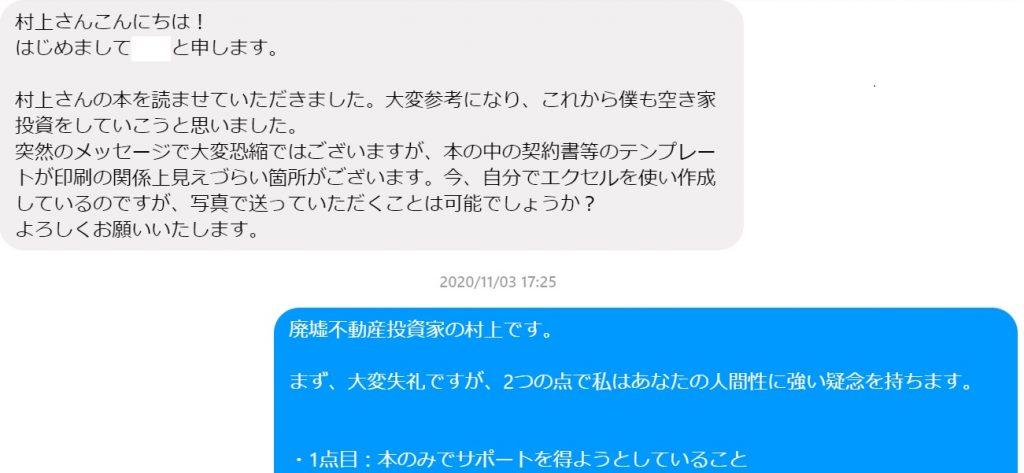 村上さんこんにちは! はじめまして**と申します。 村上さんの本を読ませていただきました。 大変参考になり、これから僕も空き家投資をしていこうと思いました。 突然のメッセージで大変恐縮ではございますが、 本の中の契約書等のテンプレートが印刷の関係上見えづらい箇所がございます。 今、自分でエクセルを使い作成しているのですが、 写真で送っていただくことは可能でしょうか? よろしくお願いいたします。 廃墟不動産投資家の村上です。 まず、大変失礼ですが、2つの点で私はあなたの人間性に強い疑念を持ちます。 ・1点目:本のみでサポートを得ようとしていること 元からの友人なら普通に何でも教えますが、 私のスクールとかコンサルで、15万や30万を支払って学んでいる方が300人ほどおられます。 さすがにここで全くの他人に無料で教えてしまうとそういう方々への背信となりますね。 ・2点目:契約書を求めている時点で何も学んでいないこと そもそも、拙著でもDVDでも繰り返し説明しているように、 私が使用している契約書や各種書式は、ネットで検索して一般的な書式をダウンロードしたものです。 私が1から作成したものではありません。 何も学ばずに質問することは双方の時間の無駄であり、私にとっては失礼な質問です。 また、契約書で人の心を動かせると思っていることも問題です。 廃墟不動産投資は、困っているオーナーを助けてあげることにより対価を得ています。 契約書より信頼関係が大切です。 詳しくはこちらの記事をご覧ください。 私の今回の回答に腹を立てるか、今後の参考にされるかはあなたの自由です。3,800,000円の契約書とは?